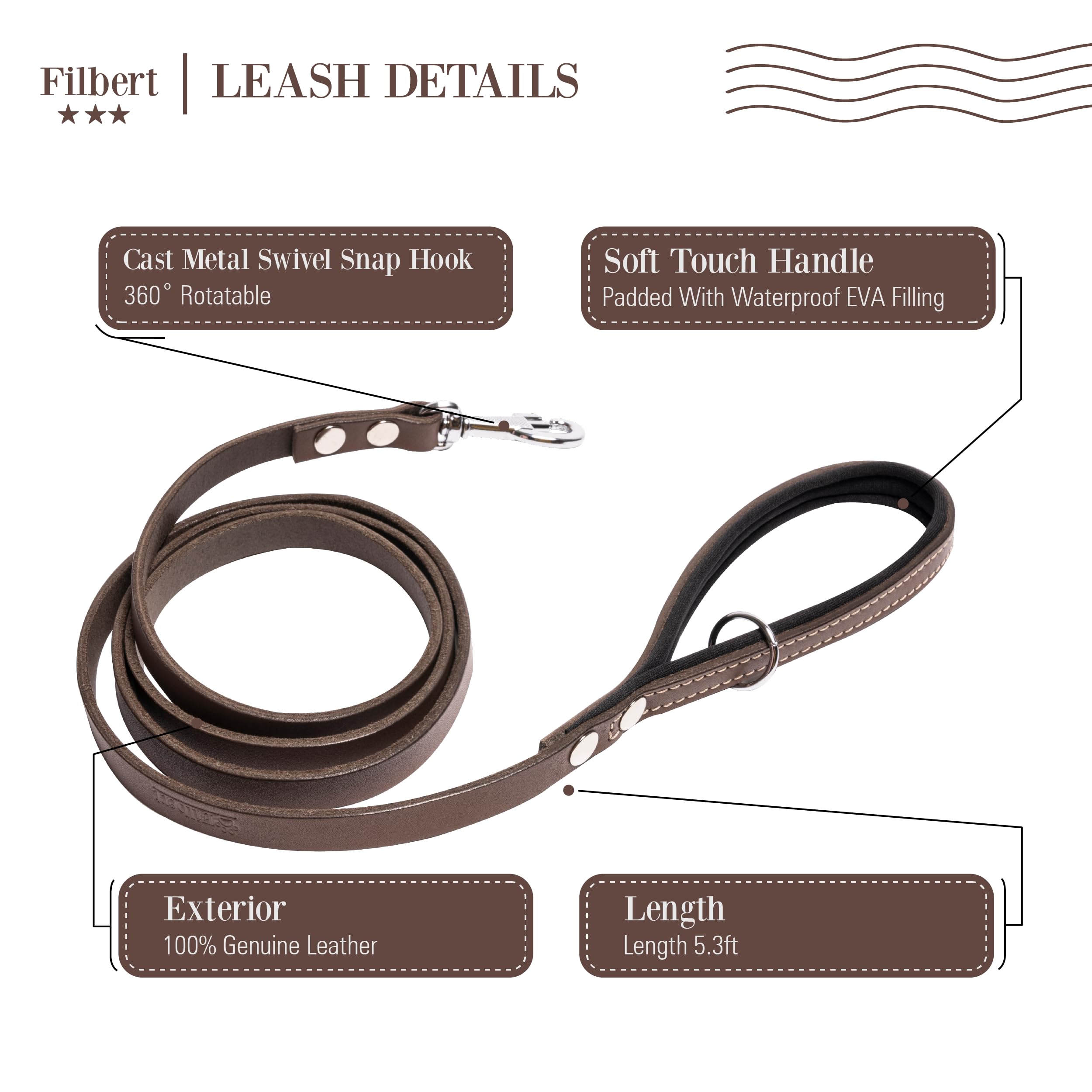 Filbert Genuine Leather Dog Leash, Strong Leather Leash for Small, Medium, Large Breed Dogs, 5.3ft, Soft and Comfortable, Durable, Heavy Duty, Brown