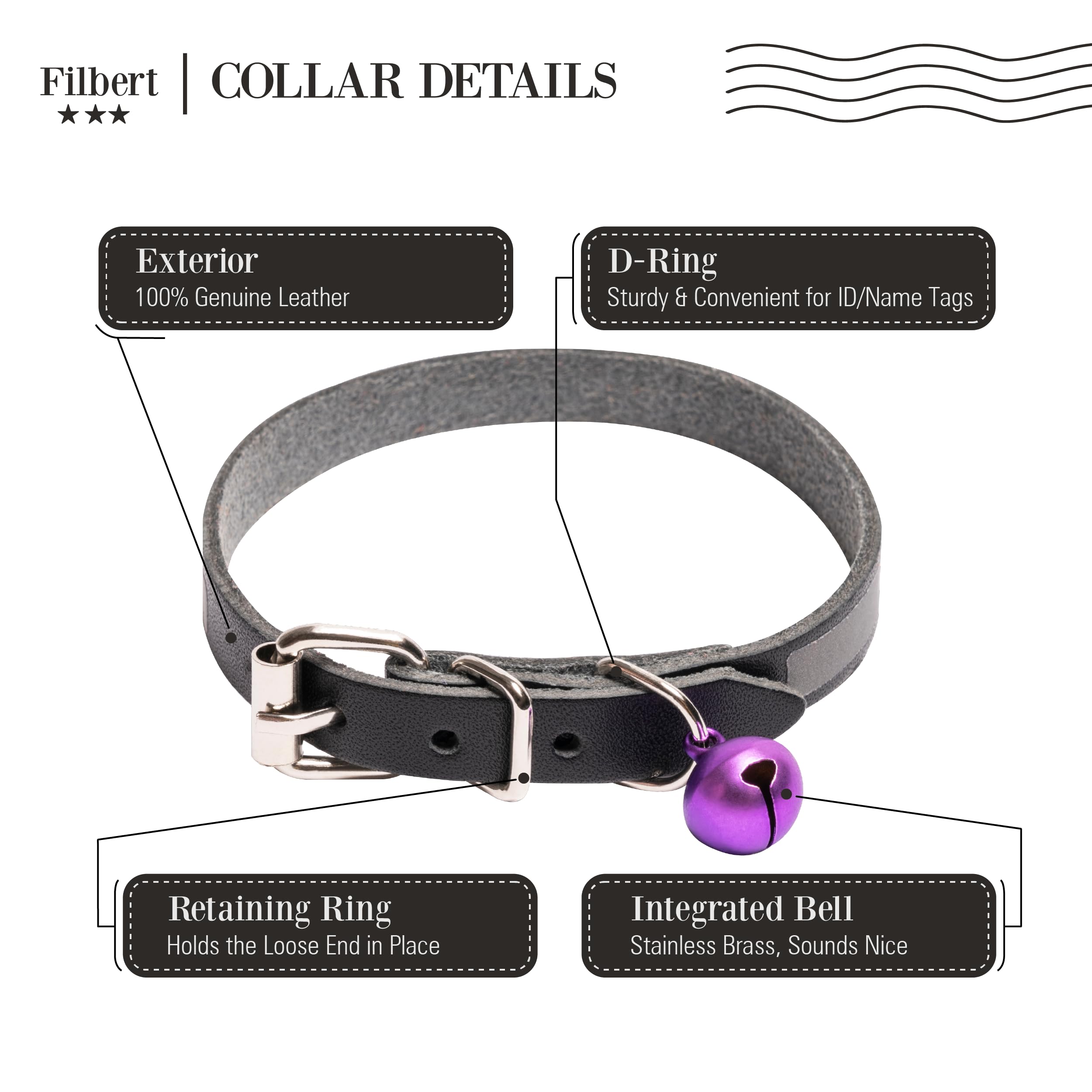 - PROTECTIVE AND DURABLE💪: We know what you are looking for. A meowtastic genuine leather cat collar, honest-to-goodness gorgeous yet sturdy, and will hold up for years; handmade with passion and attention to detail, will make it easy to spot your Furball Overlord😾 during nighttime adventures and add an extra layer of security, and will help you keep track of your mischievous Master of Chaos 🙀. So, we are thrilled to introduce Filbert's reflective cat collar with bell
