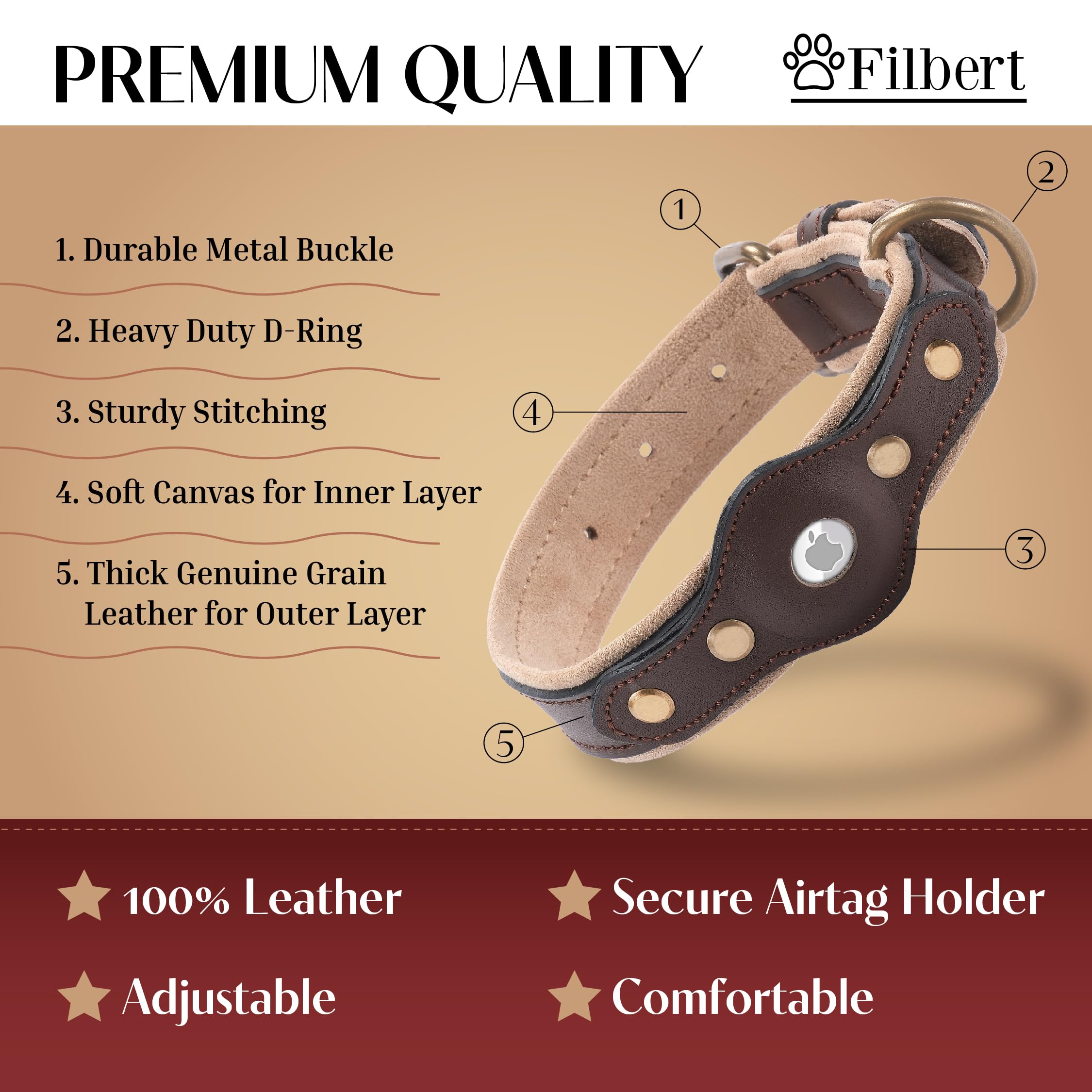 Filbert Leather Dog Collar with Airtag Holder, Upgraded Secure Airtag Collar, for Large Dogs, Leather, Waterproof, Premium, Adjustable